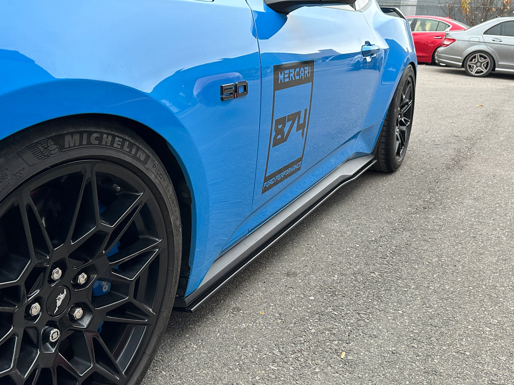 Indestructible side skirt extension setup for the S650 Ford Mustang . This setup contours perfectly to the underside of the OEM body for a seamless installation.